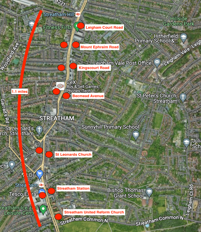 I arrived at Streatham station at 11:30 and set off walking about a mile northwards along Streatham High Road towards Streatham Hill station to see what I’d find, before wandering around the LTN itself to see how ‘low’ traffic levels actually are in the ‘low traffic neighbourhood’.