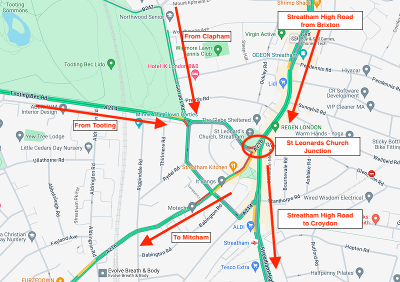 A pedestrian phase on those lights can mean the traffic beyond the junction moves ahead a short distance so traffic then comes out of the LTN on Pendennis Road and tails back round the corner meaning the lights go green for Streatham High Road but the road ahead is blocked again, and nothing moves. And so it goes on.