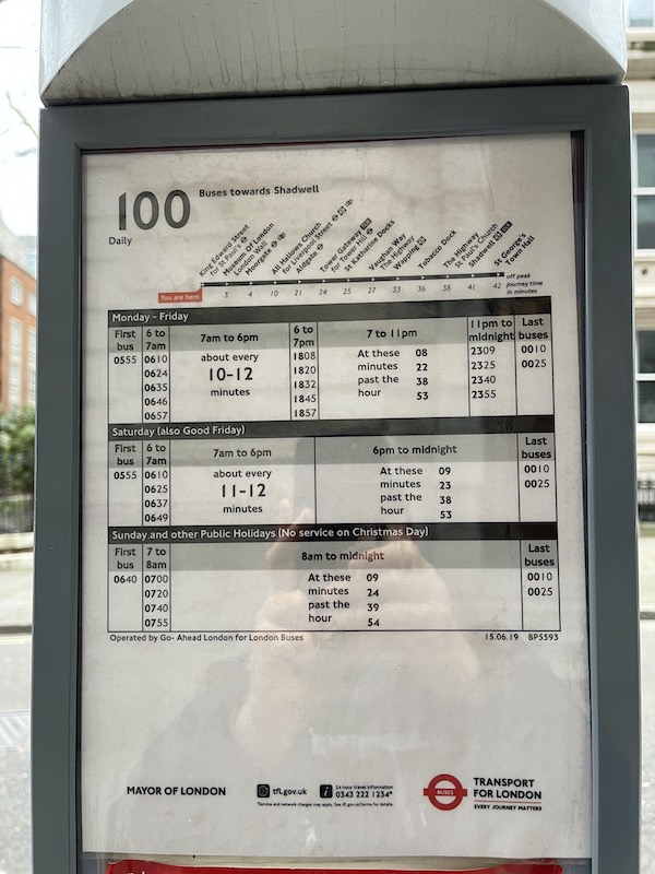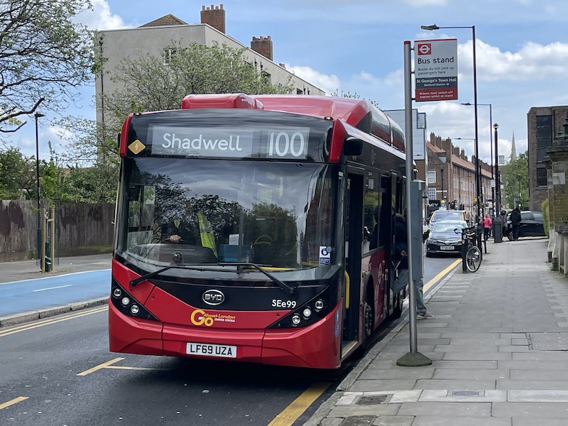As you can see it’s not the busiest of route 100s. Those in Stevenage/Hitchin; Crawley/Redhill; Lincoln/Scunthorpe and Manchester/Warrington as featured in previous blogs in this series easily surpass the numbers travelling between Shadwell, Wapping, Aldgate and St Paul’s. There’s also no doubt it has the most sedate journey speed and layover allowance at termini of the routes featured with the London characteristic of two buses on stand time at each end.