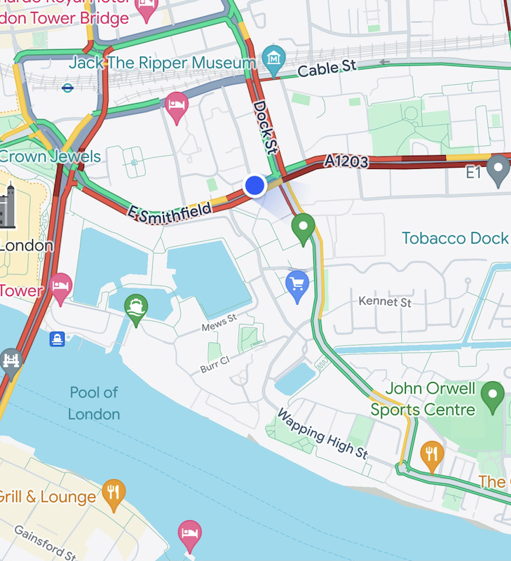 Having clocked the long queues of traffic from the east approaching Tower Bridge on the A1203 (see above map), I decided to abandon the idea of making a return journey on that occasion. Life is too short.