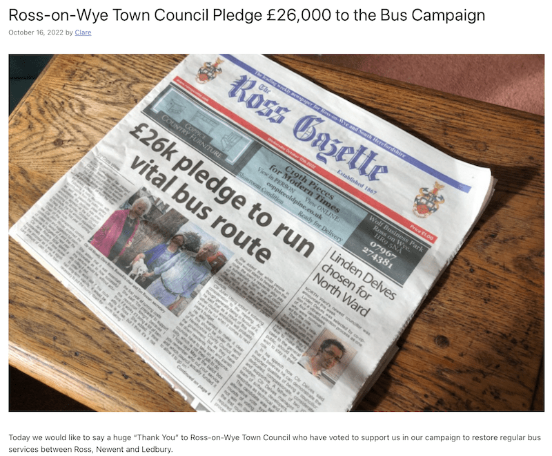 For example, having received positive indications and support from both Gloucestershire County and Herefordshire Councils in summer 2022, Clare set about raising funds from Town and Parish Councils including using social media to let residents know when meetings were being held so they could attend and contextualised the amount being asked for in easy to understand terms such as £3 per voter for Town Councils and £2 per voter for Parish Councils.