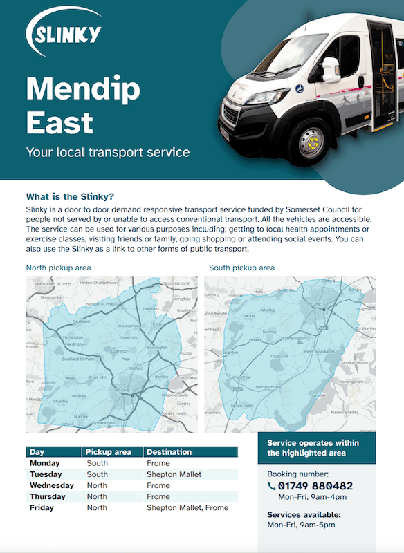 Slinky has been operating in four separate areas – Mendip, Sedgemoor, Taunton/West Somerset and South Somerset with each sub-divided into zones from where passengers have an option of a journey to different destinations according to the day of the week. For example the Mendip area is divided into three zones with Mendip East divided again into a North and South pick up area taking passengers to either Frome or Shepton Mallet on different days.