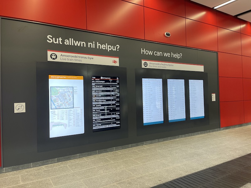 There aren’t any wall mounted printed timetables or diagrams showing what service departs from where, but the electronic signs are very clear to read and show departure stands and the aforementioned timetable booklets are available – although these were printed prior to the Bus Interchange coming on stream so are not up to date in that respect. There were plenty of TfW staff on hand to help passengers when I visited yesterday late morning and across lunch time.