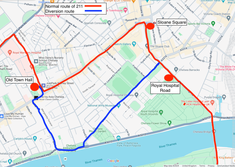 On my journey back from Battersea to Sloane Square I ended up having to take two buses with the nearest point route 211 (and the same applies to route 11) to Sloane Square being either the bus stop at Royal Hospital Road (before the diversion) or Chelsea Old Town Hall (after the diversion) which is over half a mile from the Square.