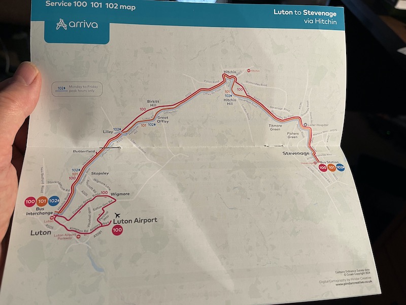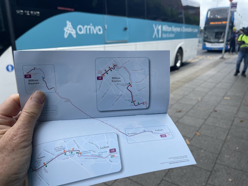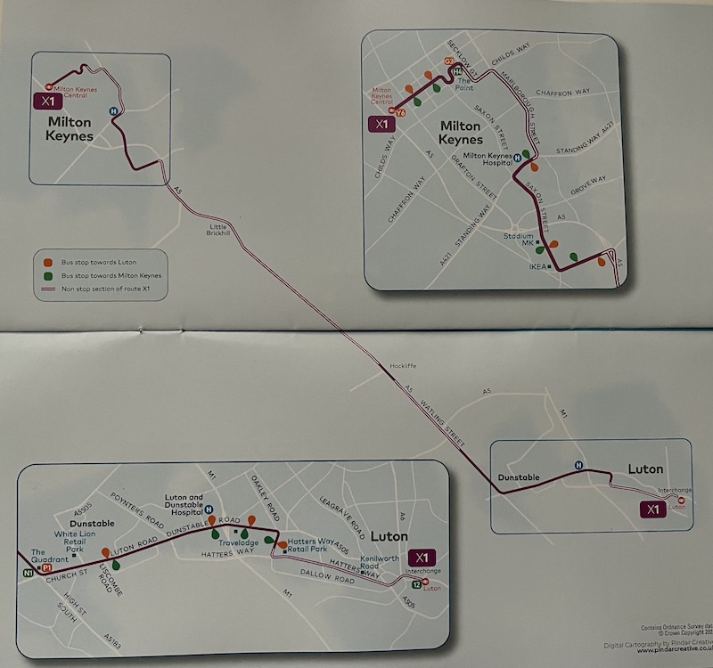 Bearing in mind ….. Arriva has had the three coaches being used on the service sitting spare since before Covid; Milton Keynes and Luton (Arriva has a base in both) are big enough city/towns that should be able to sustain two direct fast buses an hour (ie the X1 in addition to the MK1) by two different routes; the A5 is more direct than the M1 (look at the map above) and is perceived as being just as quick as the M1 (which can be prone to delays); supplementing the F70/F77 with a quicker route between Milton Keynes and Dunstable is a good idea; onward travel connections between the Interchange and airport are good; there’s a printed timetable leaflet with route map …. then Toby and Matt could be on to a winner.