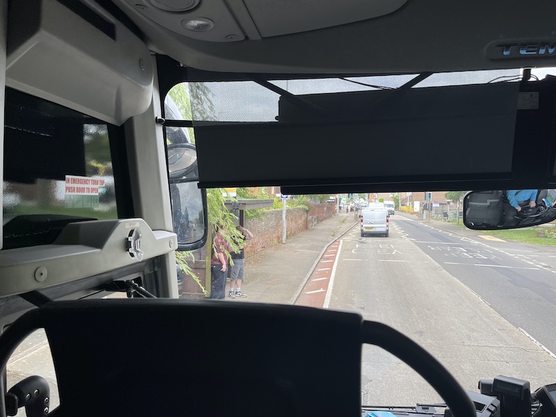 Those Temsa’s have perforated sections on their sun blinds which can be seen in the picture at the top of the windscreen, I suspect it is standard spec on any coach. What is actually largely obscuring Rogers view forward is the destination blind box, though the non-perforated section of the blind is also there as the driver has the blind almost fully up (as he doesn’t need it) and lining up with the destination blind and the bottom section has to be non-perforated such otherwise it won’t function as a sunblind for the driver.