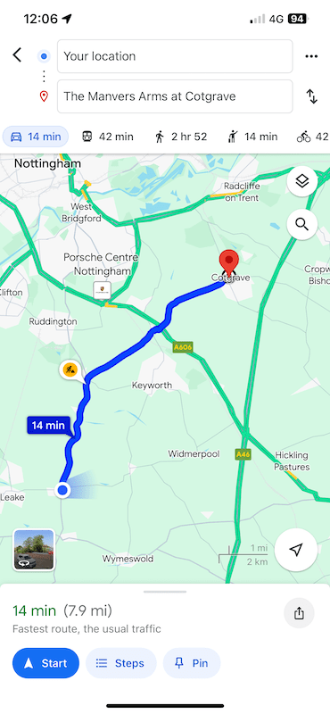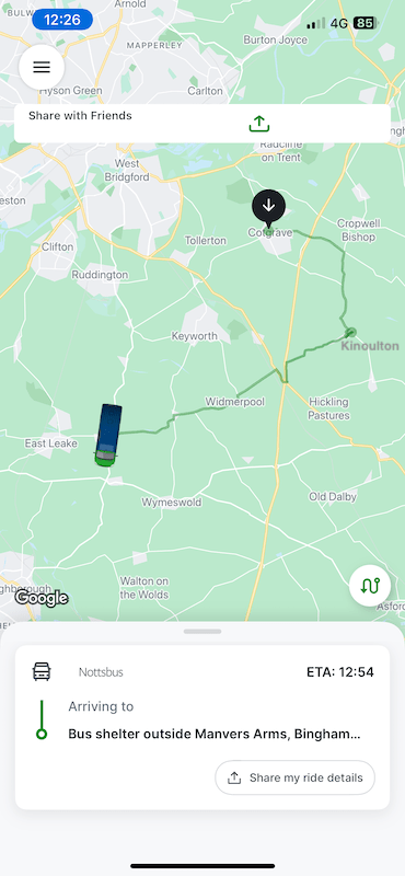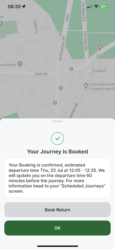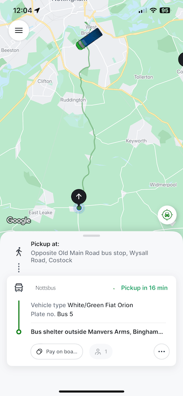 Like the other four daytime geographic zones it operates between 07:00 and 19:00 on Mondays to Saturdays. Being the first week, I had no trouble booking a journey a couple of days in advance to take me from Costock (bottom left on the map) to Cotgrave (top right of centre on the map) at 12:05.