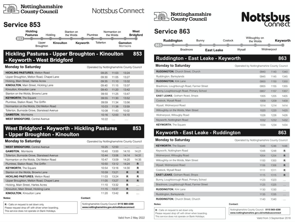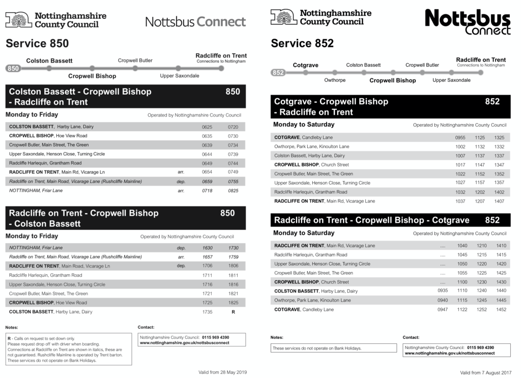 Roger, The 852 timetable shown in your blog is unfortunately incorrect, it was revised in May 2019 and was wrong on the Nottinghamshire County Council Website. The 2019 timetable consisted of 2 journeys, Not Saturday (1030am/1215pm), from Colston Bassett ONLY, with two ‘notional’ return journeys operating ONLY when requested by passengers boarding an outward journey according to the leaflet. I can’t find the leaflet on the web but a timetable can be found on bustimes from April 2023 here: https://web.archive.org/web/20230401042026/https://bustimes.org/services/852-cotgrave-cropwell-bishop-radcliffe-on-trent