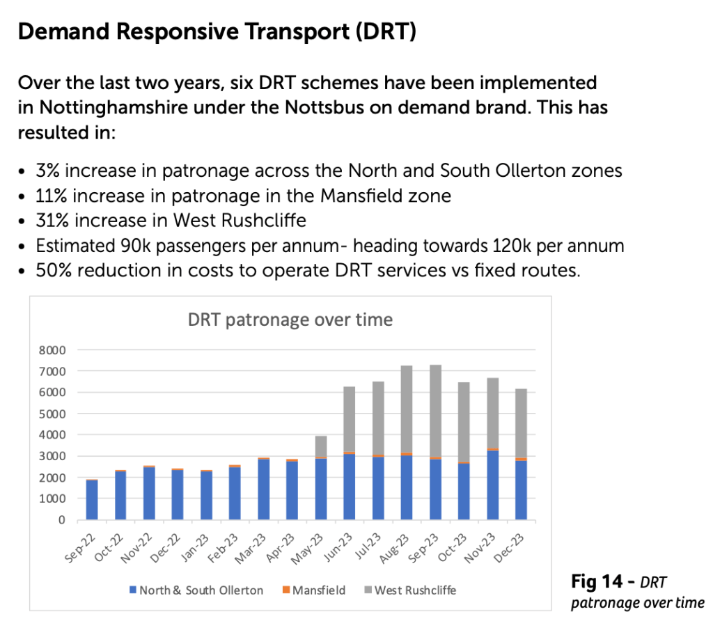 Last Monday saw a sixth zone added to the County’s DRT offering – Central Rushcliffe – while from tomorrow the Mansfield evening service is extended to operate on Mondays, Tuesdays and Wednesdays (as well as ThFS) and Newark also receives a new evening DRT service on Mondays to Saturdays between 19:30 and midnight making for a seventh zone. According to Nottinghamshire’s Bus Service Improvement Plan (BSIP) there are also plans to introduce new evening DRT operations in Worksop and Retford in due course.