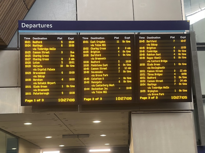 Like Victoria, London Bridge sees both Southern and Southeastern trains but in 2018 when ‘Thameslink 2000′ finally became a reality, and the station having been completely rebuilt so it could handle the greatly expanded cross-London network, more destinations were added including Cambridge, Peterborough, Horsham and Rainham, as well as East Grinstead in the peaks, supplementing the longer standing Bedford and Brighton.