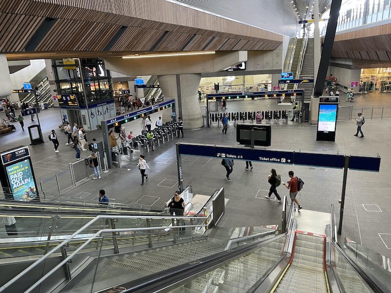 … epecially by the escalator, stairs and lift down to the concourse below.