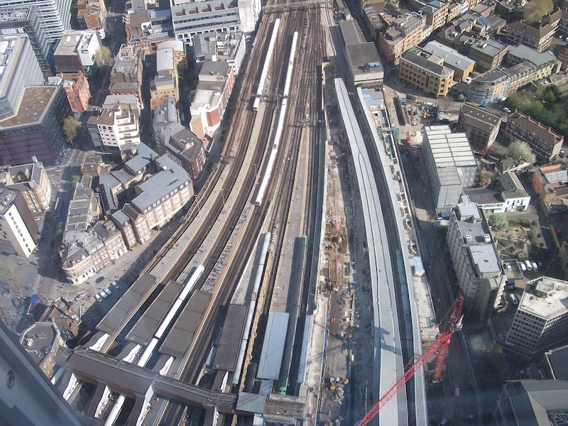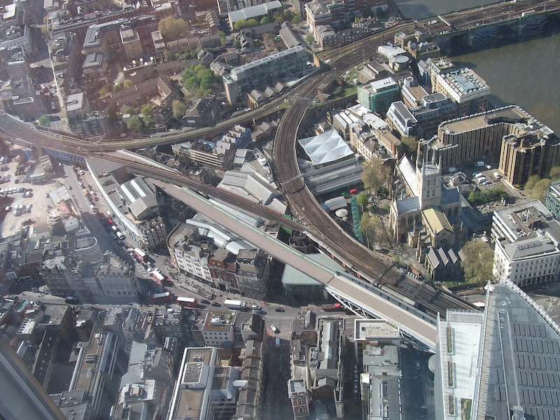 I found these photographs taken 10 years ago in 2014 during a visit to the Shard which towers over the station. These show the additional viaduct installed over Borough Market so the tracks to and from Charing Cross, which Thameslink trains had previously shared, could be split off and both lines given exclusivity. Tracks to Cannon Street can be seen diverting off to the top right across the River.