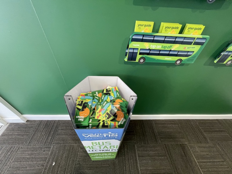 Bus timetable booklets and other promotional booklets with details of the Island’s leisure services are widely available on the Island, on board buses…