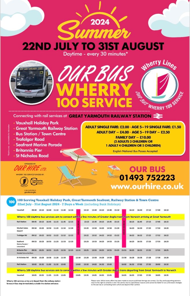 First up, from 22nd July and operating through until this Saturday, 31st August is the “WHERRY 100 SERVICE” operated by Our Hire Ltd (trading as OurBus) in Great Yarmouth.