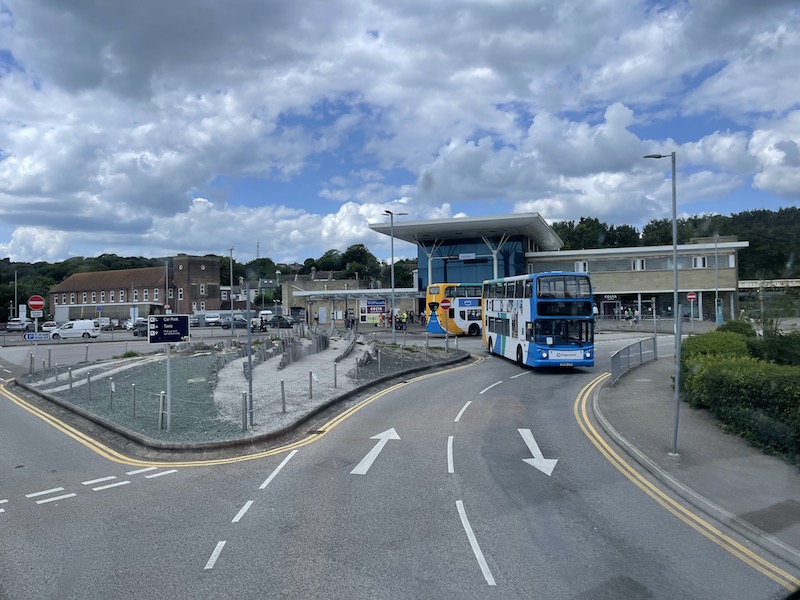 … and finally arrived at the bus station in front of the railway station at 13:49, still half an hour late, and after the departure time from Conquest Hospital for the bus’s next return journey (13:45).