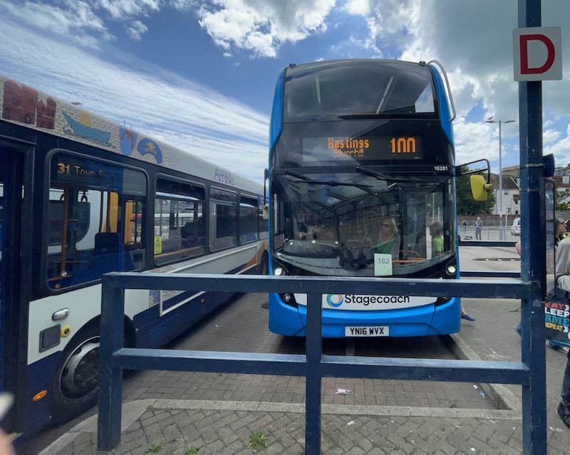 Four double deck buses are needed for this route 100 with ADL Enviro400s from Silverhill garage in Hastings, and I noticed very few now carry the Wave branding, once a big feature of the route and still displayed on bus stop plates.