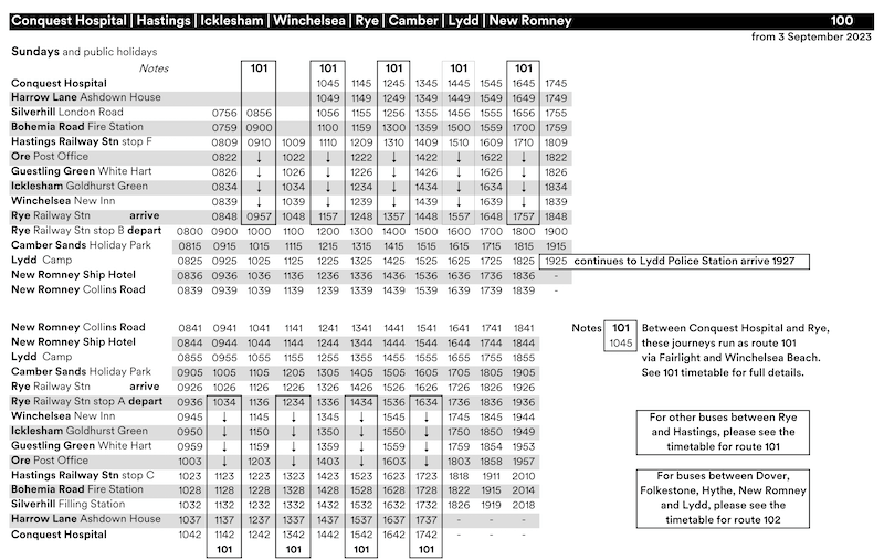 On Sundays the 101 is extended at both ends of its route, northwards to Conquest Hospital in Hastings and eastwards from Rye to Lydd and New Romney and as both the 100 and 101 run two-hourly to a coordinated timetable, it makes for an hourly frequency on common sections of route.