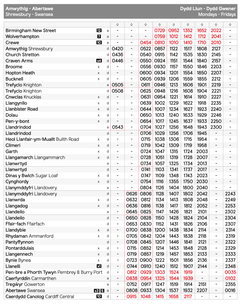 Transport for Wales (TfW) has expanded the Heart of Wales timetable to comprise five return journeys on Mondays to Saturdays supplemented by an additional return in the early morning and evening at the southern end as far north as Llandovery and from the northern end as far south as Llandrindod.