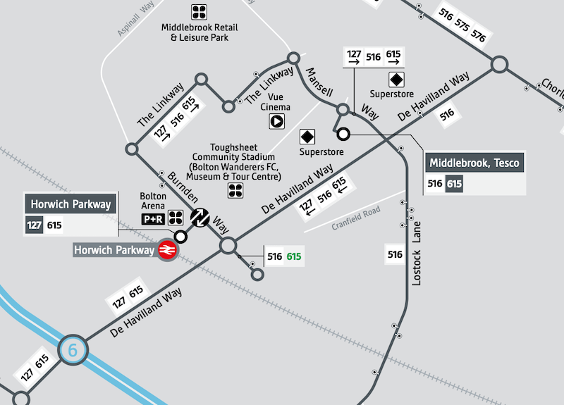 Whatever the reason for its demise it’s certainly good to see route 615 back on the bus map. It links Wigan and Aspull (north east of Wigan) with Horwich Parkway railway station and the large Middlebrook retail park with its many warehouse type outlets, Tesco Extra and Asda, a stadium (Bolton Wanderers) and an arena.