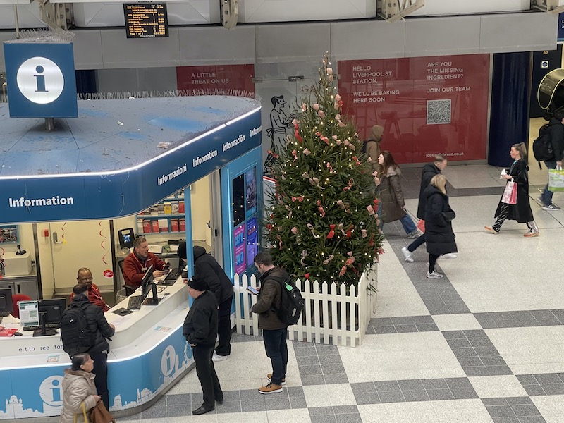 After those failures, we come to the Top Seven Festive London Termini Christmas Displays 2024. In seventh place is Fenchurch Street where the judges were impressed with the ingenuity of the team to put on a display despite tight budget constraints (and with minimal Health & Safety protective barriers too) …