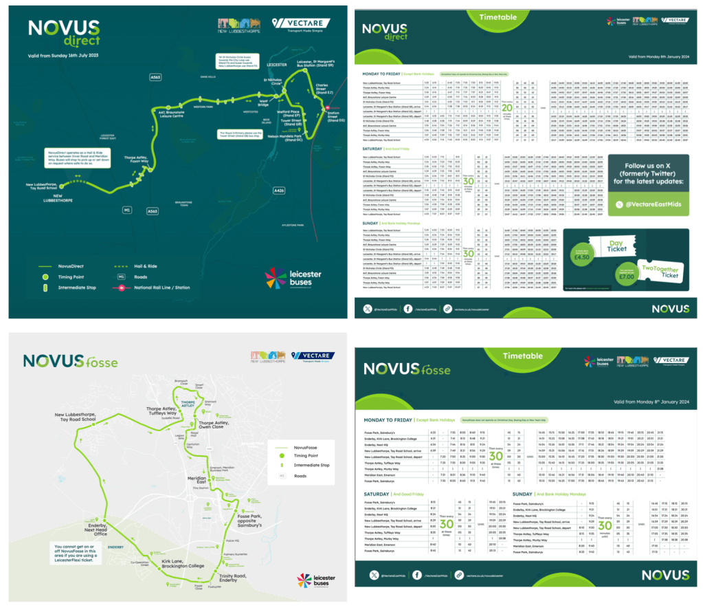 … but when Arriva pulled out after the three year Section 106 developer funding ended in July 2022 Vectare did a deal with the developer to operate a half hourly fixed route between New Lubbesthorpe and Leicester branded as Novus Direct (subsequently improved to every 20 minutes) with a two bus Novus Fosse branded DRT operation to cater for more varied journey demand but which was subsequently replaced with a fixed circular route half hourly frequency.
