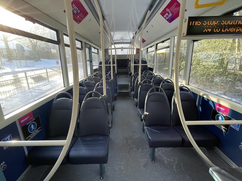 The interior is a bit of a disappointment for a brand new 74 plate bus. It does have usb sockets and, as required by legislation, next stop displays (including one facing the wheelchair space) and announcements…