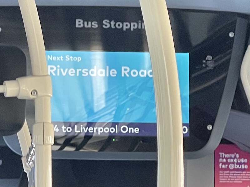 Five alighted at the New Mersey Shopping Centre and as we continued into the city centre we picked four more up but I noticed that the bus stop names being displayed and announced on board didn’t tally with the names shown on the Merseytravel online map shown above.