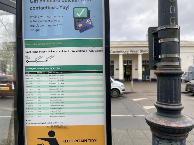 There’s a bus stop right outside Canterbury West for Stagecoach route Uni2 to the city centre every half hour after the morning peak and other buses depart a short walk away in St Dunstans Street.