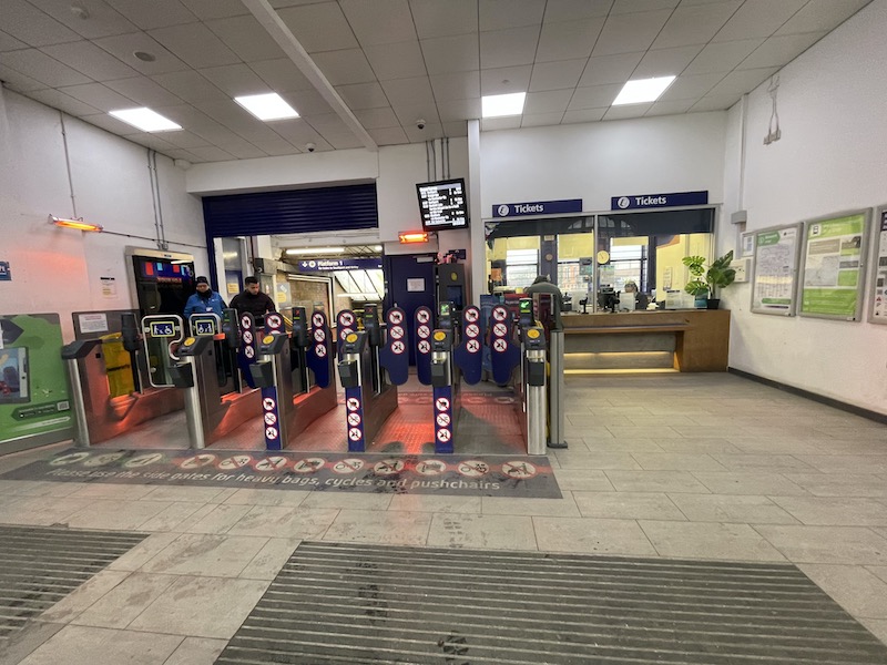 The station has a minimal entrance area with a five bay gateline. There’s a two window ticket office and two mega-size ticket machines one of which takes cash.
