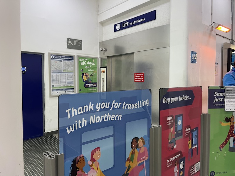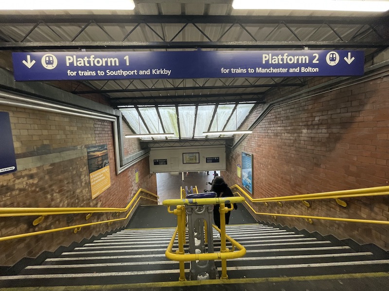 The directional signs above the stairs still thinks trains can be taken to Kirkby, whereas this was cut back to the new Headbolt Lane in 2023.