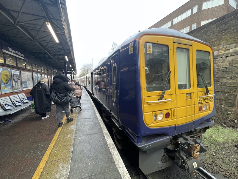 In the other direction the Leeds originating journey terminates at Wigan Wallgate each hour, the Blackburn continues to Headbolt Lane and the Oxford Road and Stalybridge go to Southport. It sees a variety of train types including the unusual Class 769 which were formerly Class 319 in the Thameslink fleet.