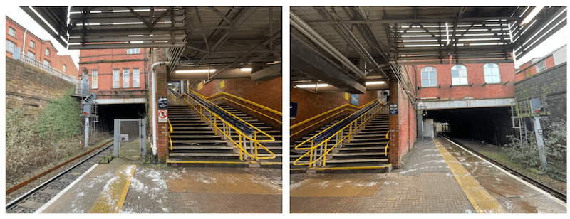 … and round another corner is the subway under the tracks with stairs and lifts up to the two island platforms above.