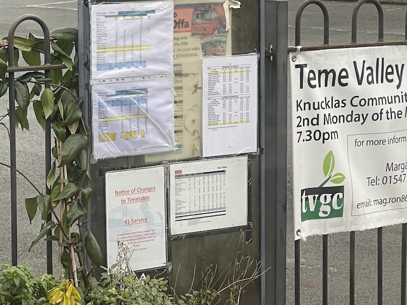Celtic Travel also has the timetable on its website and I noticed someone in Knighton has taken the initiative to display a timetable at the bus stop in the village where the bus pauses for a couple of minutes.