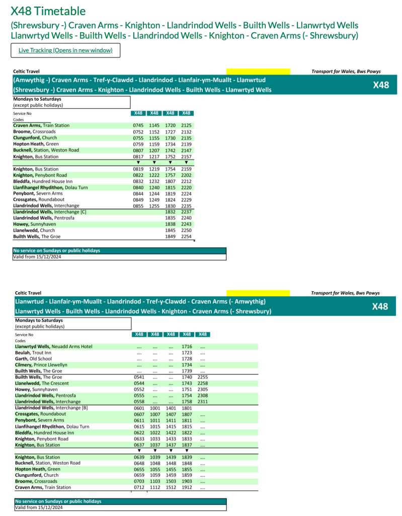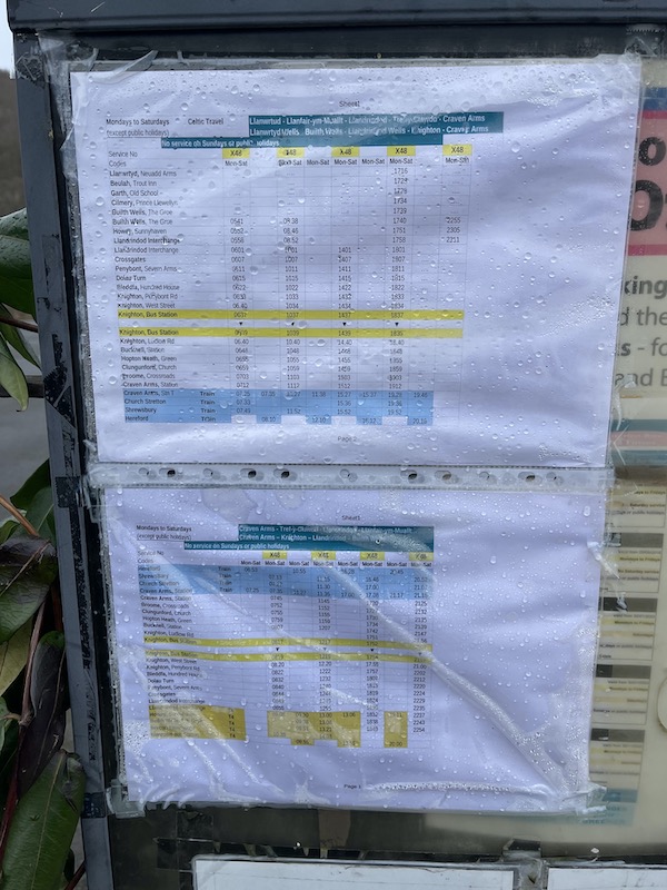 These queries are symptomatic of a lack of information about route X48. No timetables or any information were on display at either Craven Arms or Llandrindod Wells so goodness knows how TfW thinks passengers are going to be enticed and reassured to travel.