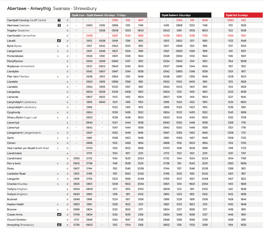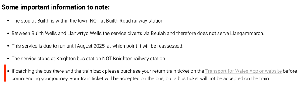 It’s a sparse timetable with four and six hour gaps between journeys but then so is the rail timetable and, aside from an early morning northbound direct clash, it’s obviously been designed for one timetable to complement the other as far as possible with, for example, Mondays to Saturdays northbound departures from Llandrindod Wells towards Craven Arms at 05:55 (train), 06:01 (bus), 07:32 (train), 10:01 (bus), 11:40 (train), 14:01 (bus), 15:33 (train), 18:01 (bus), 20:24 (train).