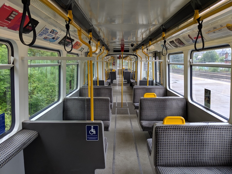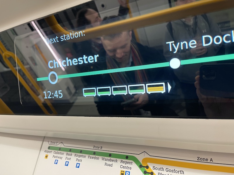 Passenger information screens above side windows show, to what’s becoming a standard layout, the next few stations (which is updated during the journey) and the terminal point…