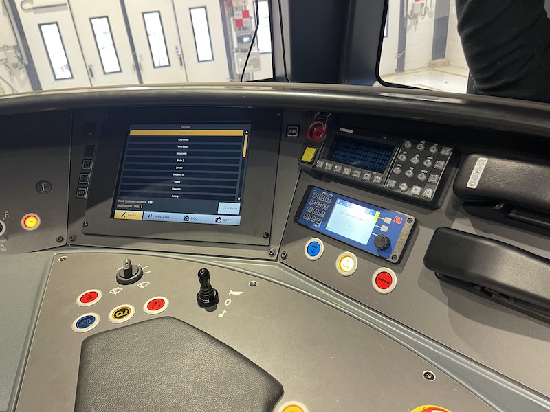 The screen to the left of the radio equipment is also used to display the platform with images from side mounted cameras along the length of the train thus removing the need for mirrors and screens on the platforms.