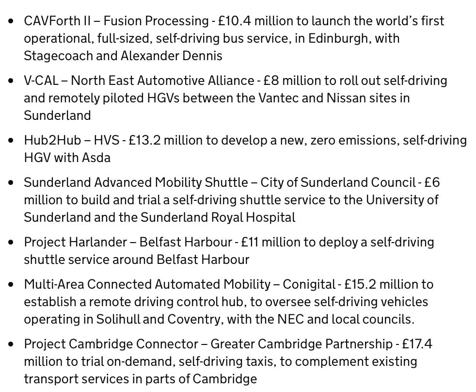 The previous Government and private industry have both provided £42 million in grants to fund the Centre for Connected and Autonomous Vehicles and Connected and Automated Mobility programme. This comprises seven projects, two of which have involved buses – Edinburgh and Sunderland.