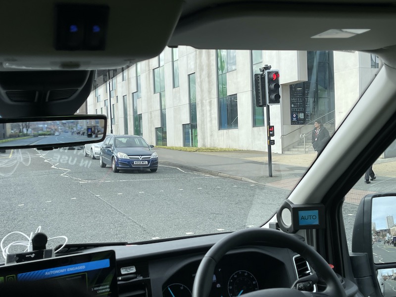 At the next set of traffic lights we stopped for a red light and there was a short delay before heading off, when the green showed, and then we immediately stopped again and then started again. Anthony thought it might be to do with the barriers at the edge of the pavement on the kerb, which were close to our nearside and he explained that hiccup would automatically be fed back into the system and the software potentially modified to learn from that experience.