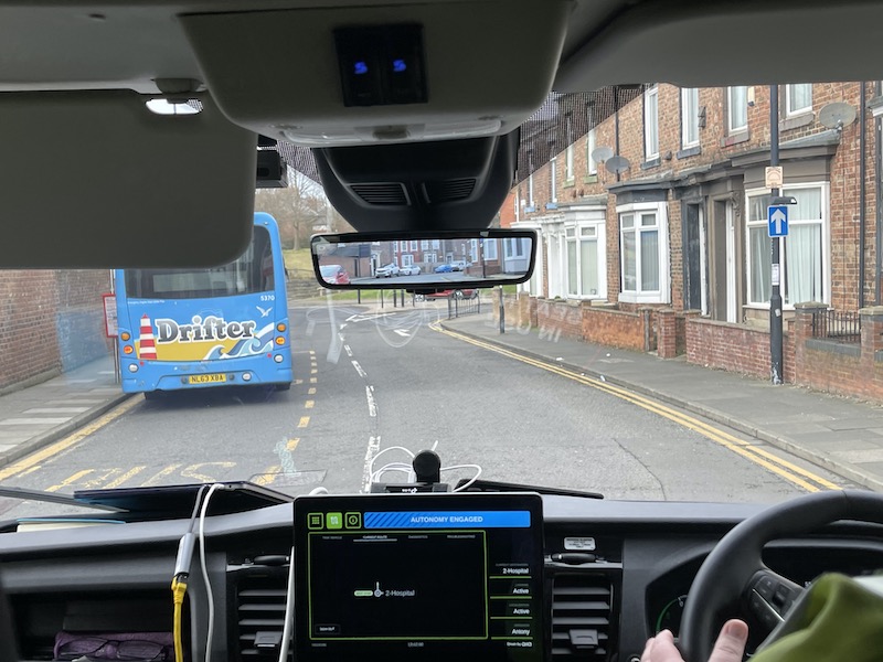 In the hospital grounds the bus hesitated when it observed a pedestrian standing close to the pavement edge at a Zebra crossing – she didn’t want to cross and was just loitering – but it was a good example of taking a safe approach. After a few seconds the bus realised she didn’t want to cross and we headed onwards, again without Neil having to intervene.