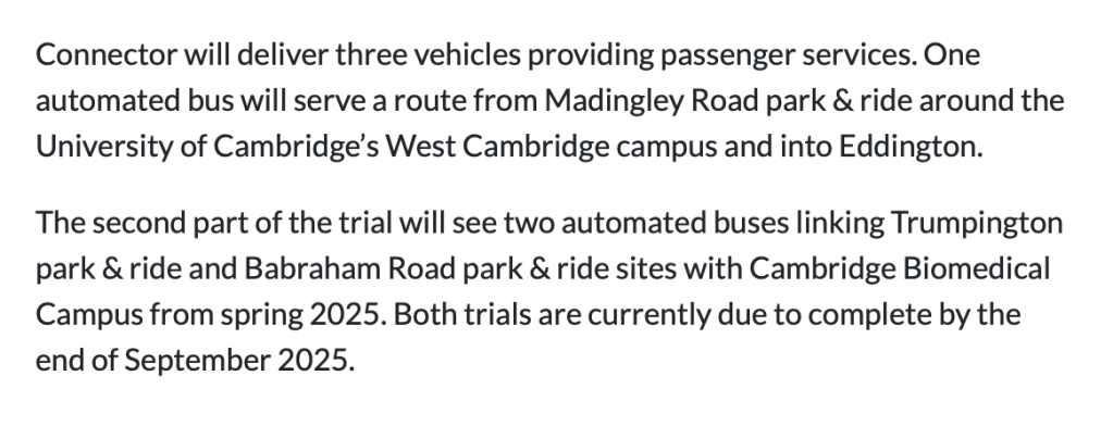 With the Edinburgh trial ended and SAMS running until the end of the month, it’ll be interesting to see what comes next. The Cambridge “on demand” trial sounds like it’s combining autonomous driving with DRT which will be interesting to see although the Greater Cambridge Partnership website gives a different take on two projects using “Connector” branding which I saw on a bus parked up in Stagecoach’s Cambridge bus depot when visiting last September.