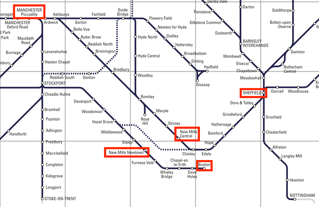 Manchester Piccadilly-Stockport – New Mills Newtown – Buxton every half hour (as existing), but there really is scope that Buxton could take 20min or 15min frequencies but there is then capacity issues unless terminate and reverse some at Stockport.