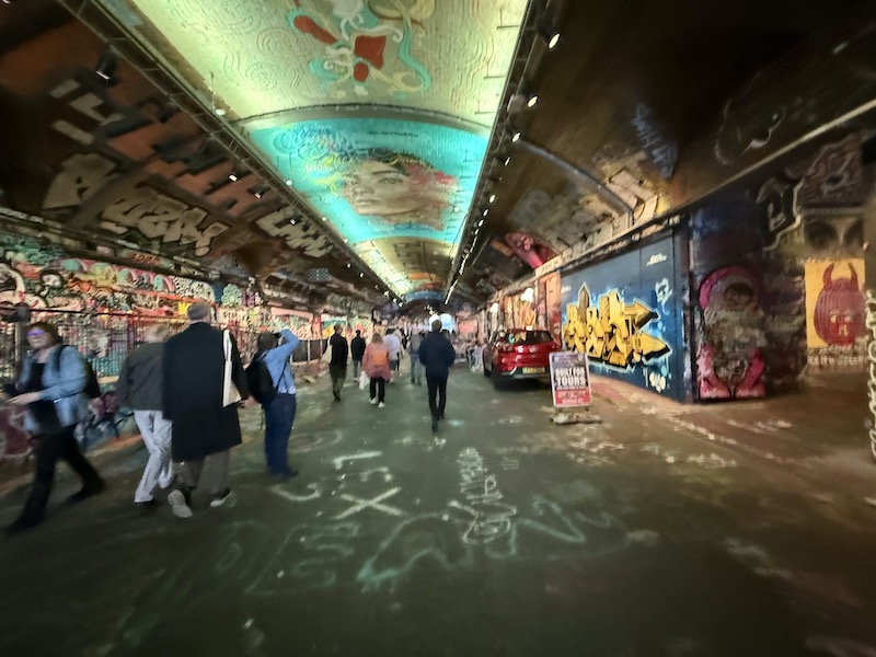 …continuing through Leake Street arches taking us under the station. Leake Street is now home to an amazing collection of official graffiti including parts of the street where lessons are given how to use spray cans…