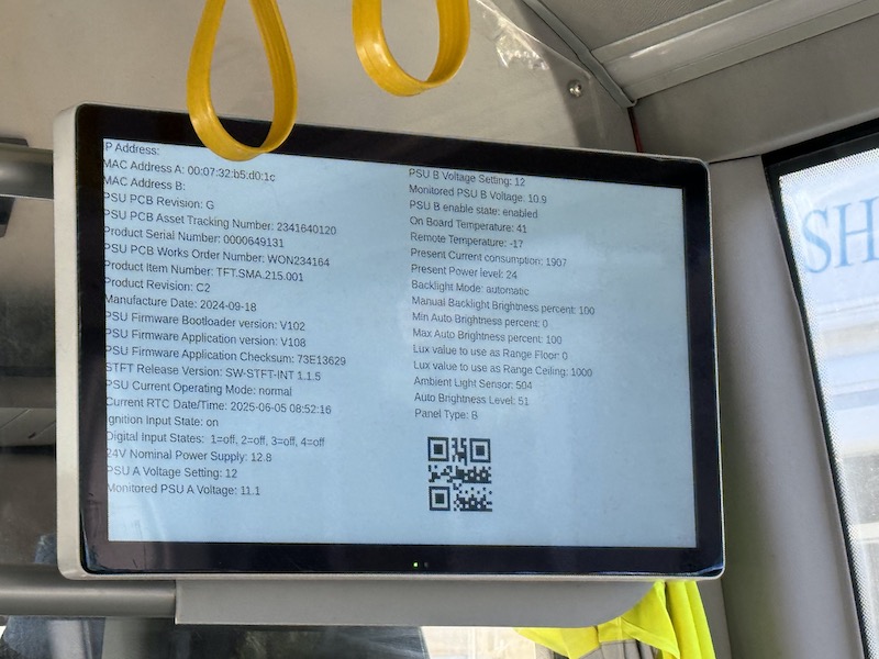 Whats displaying there is some bootup/diagnostic info, I saw the exact same thing the other week on a brand new NX West Midlands electric bus. These new next-stop announcements don’t seem very reliable as half the time they never seem to work properly!
