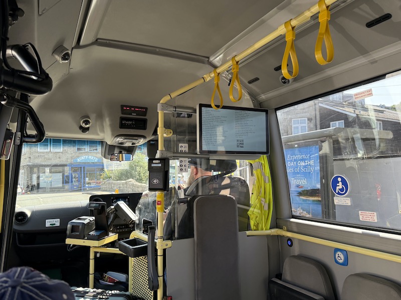 First operates a 20 minute daytime frequency (45 minutely with one bus in evenings) with each of the three buses rounding in an hour, including a generous 19 minutes stand time, although challenging driving conditions on Cornwall’s narrow roads can soon eat into that.