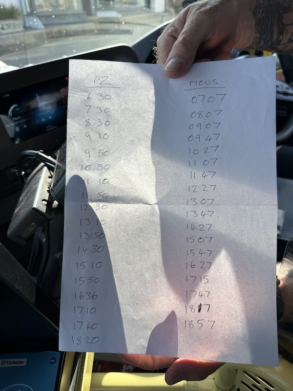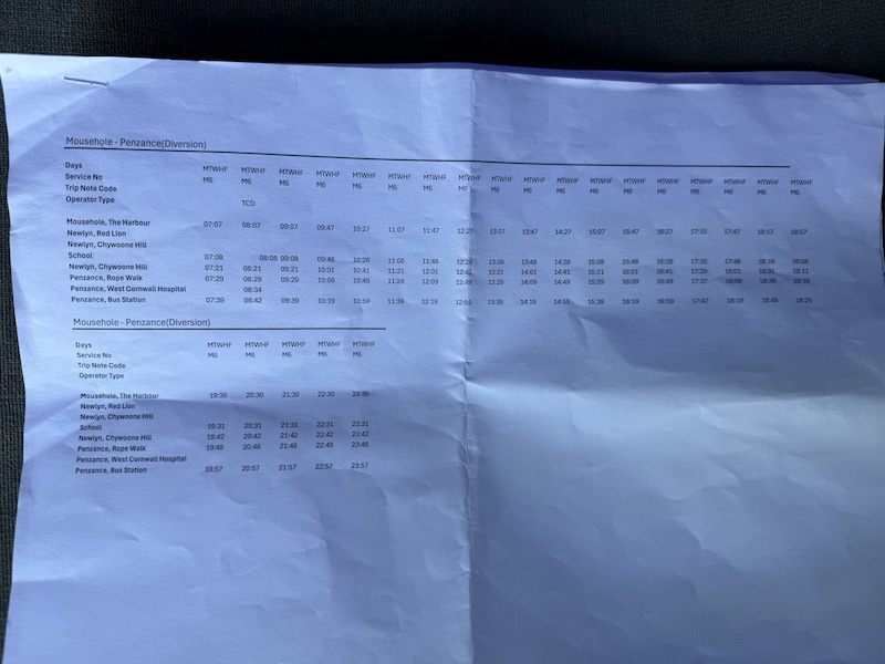 When the bus arrived into Mousehole I asked that driver if he had a temporary timetable available and he again kindly lent me his copy to take a photo from and this time it was a typed version and there was indeed an evening service – the other driver must have just given me sheet one of two!