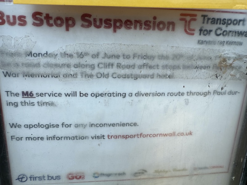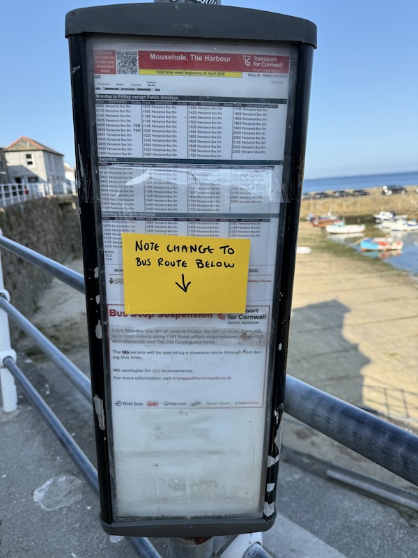 Surely it would have been possible to send a driver out for a couple of hours overtime to post a departure list at main bus stops (like Penzance Bus Station and Mousehole, for example!!). Still, it’s only for one week, so that’s all right then . . .
