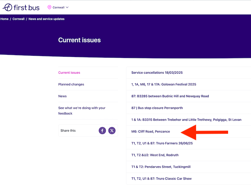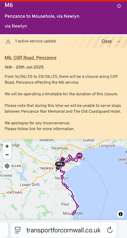 My tortuously slow browsing only found First’s and Go Cornwall/Transport for Cornwall’s websites displaying the normal timetable under route M6 but I did see a reference to a road closure all this week on the latter and advising, rather strangely, “we will be operating a timetable for the duration of this closure” whatever that means…