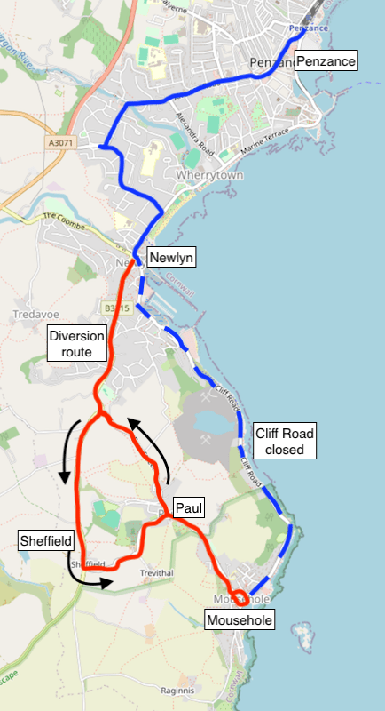 The diversion back into town went direct from Paul rather than via Sheffield which saved a bit of time, but the real issue with the diversion is on Chywoone Hill in Newlyn especially at busy times.