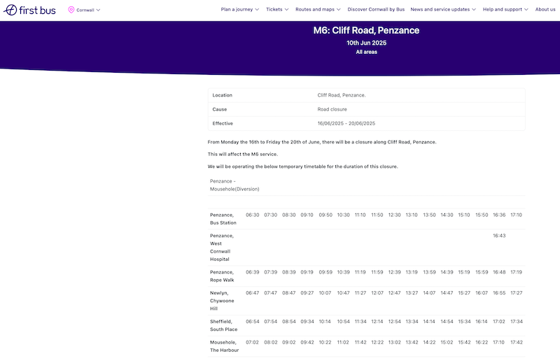 A little more digging around (google Firstbus M6) provides a list of timetables from First . . .the top one of which is a timetable from winter 2018-2019!! The sixth entry provides more information, including a temporary timetable, and is found within the “news and service updates” section: https://www.firstbus.co.uk/cornwall/news-and-service-updates/updates/m6-cliff-road-penzance. All of no use, of course, if the user has no internet access!!